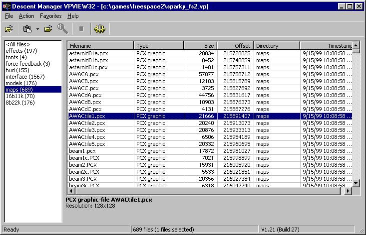 ![]() Welcome to part 2 of the Fighter Creation Tutorial, by me, Max. We are now going to create the textures for the model we created in Part 1 with Blender. You can download that model at the end of Part 1. We are going to use Paint Shop Pro. You can get it at www.jasc.com. Theres a 30-day demo, but the software itself is inexpensive. Alright, what we are looking at here is the tool VPView. Why? Because its got lots of perfectly cool textures in it that came with Freespace 2. We can use these by changing them a bit. Select the Main Game Data file, as shown. (You can get VPview here at VolitionWatch, just go to the menu on the right under FS2 there is a Downloads link.) |