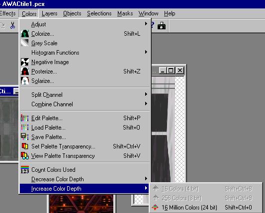 ![]() To do the graphic editing we want to do, we will have to increase the colors of the default PCX files to 16 million. (DONT save the resulting file in your FS2 directory btw.) This is the menu option to do this. Do this for all your textures now. |