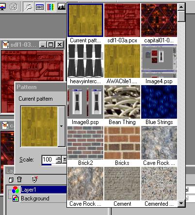 ![]() Now we want to fill the background layer with the awacs tile pattern. Click the glasses and put the background view back on, then select the background layer. In PSP 7 you will click on the black arrow in your color palette on the right hand side and select Pattern. Then, click the color box and you will select the pattern to paint with. You can select from current images as well as premade patterns. Pick the awacs tile as shown. If you are doing this with PSP 6 or earlier, you choose the pattern with the fill tool options (the bucket icon.) |
