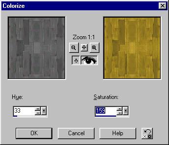 ![]() Now we will colorize the awacs tile gold. You just have to go to the Colors menu, pick Colorize, and you will see this screen. Adjust the hue until you get the color you are looking for, in this case, gold. The saturation will increase the intensity of the color. Since it was grey before, it needs a lot of saturation. You can use Colorize and other tools for the color menu to change your texture colors. |