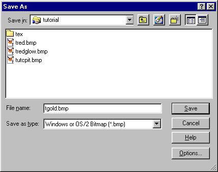 ![]() Okay, now, save the files as BMPs. Truespace likes to use BMP as textures, later when we are done we will have to convert them to 256 color PCXs of the same name for Freespace 2. Notice I am naming them all t-something. its good to name your textures for the same model with the same prefix so you can group them easily. |