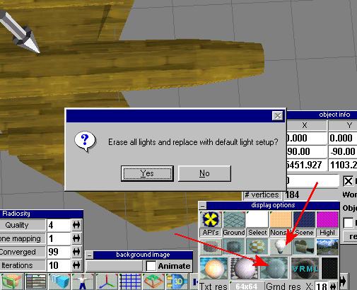 ![]() We want to do two things at this point. First we will replace the lighting with the default white light setup. This is done by clicking the white sphere shown in the picture. Then you can get a white light setup so you can see the bottom. Then click that light bulb so it will not show the lights in the picture as rendered objects (this is a good thing.) |